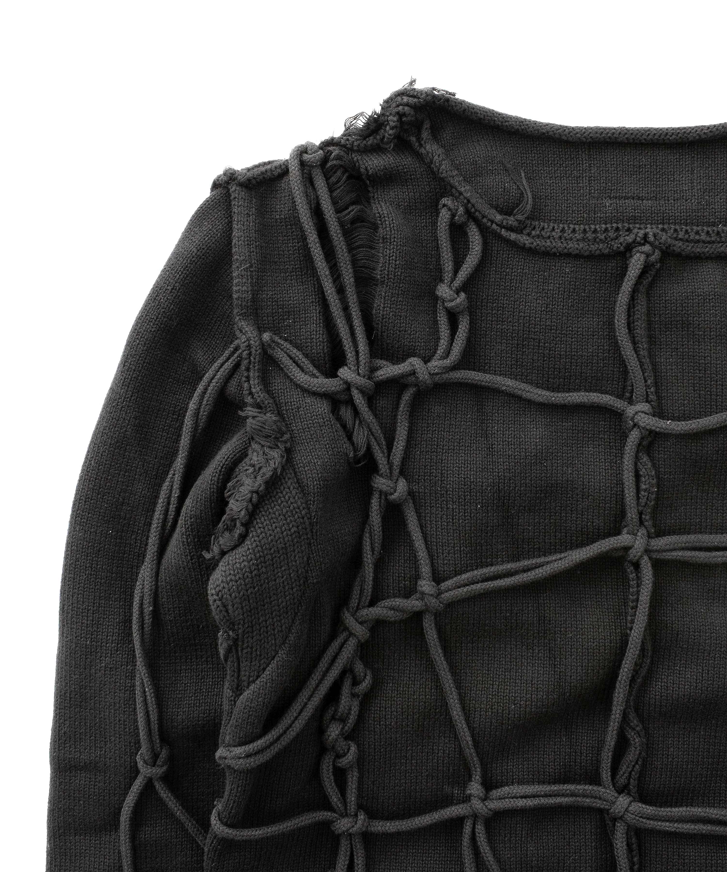 the '2024-r [rope] knit sweater' is constructed from comfortable soft cotton, with rope detailing stitched across the body and arms. various distressing details can be found across the sweater, and two thumb holes can be found at the end of the sleeves.