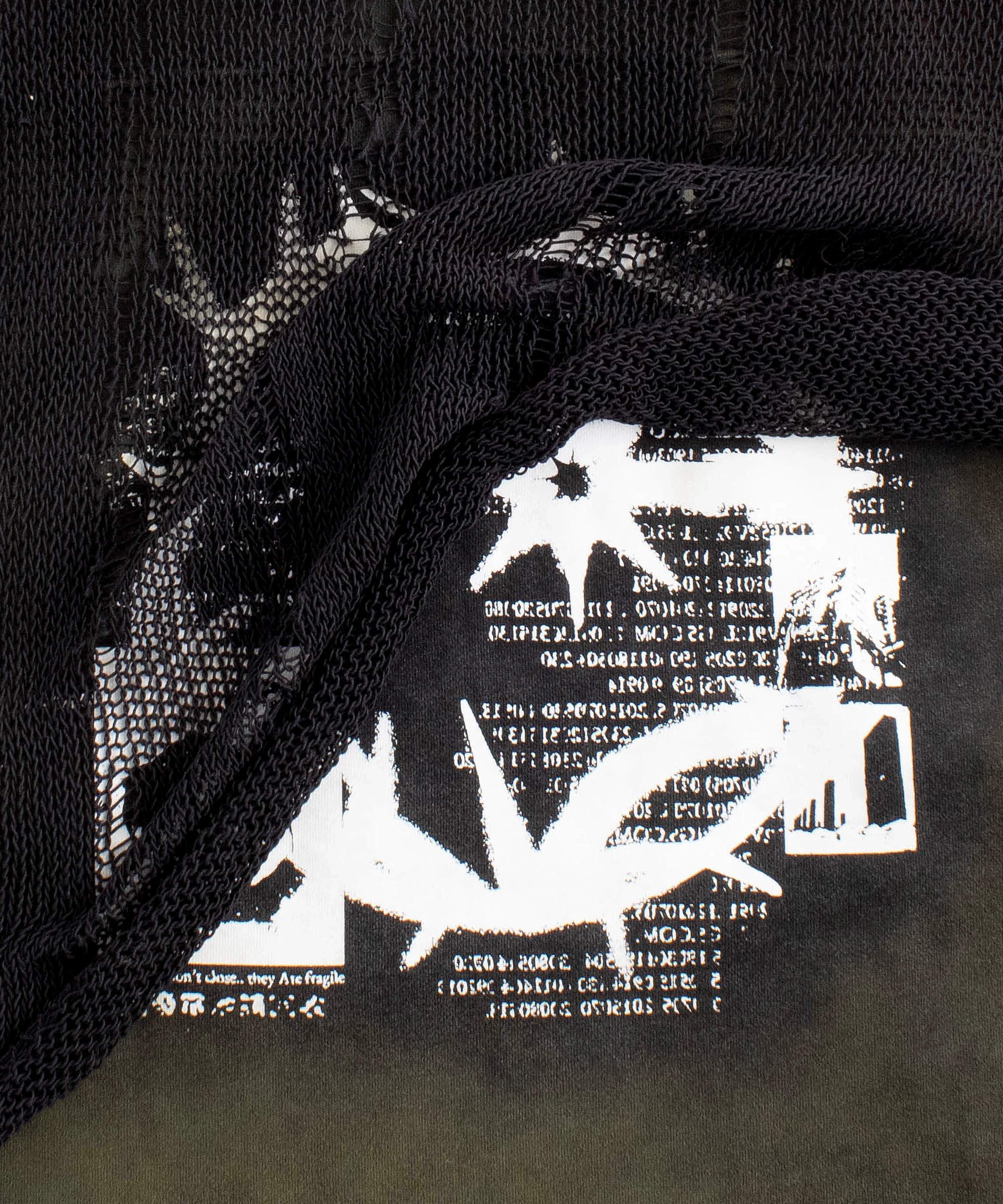 the ‘4x-T double-layer sleeveless hoodie’ is constructed from heavy cotton french terry, and is layered with a knit cotton layer utilizing an open weave technique. the top layer offers an asymmetrical look with various distressing details, and is attached to the bottom layer around the collar. the hem of the hoodie features a raw edge technique, and a beautiful dark green garment dye scales the whole hoodie. our ‘4x-T’ print covers the backside of the hoodie, and a small crepe linen patch can be found underneath the knit layer on the top of the hood. the hoodie has a boxy and cropped fit.