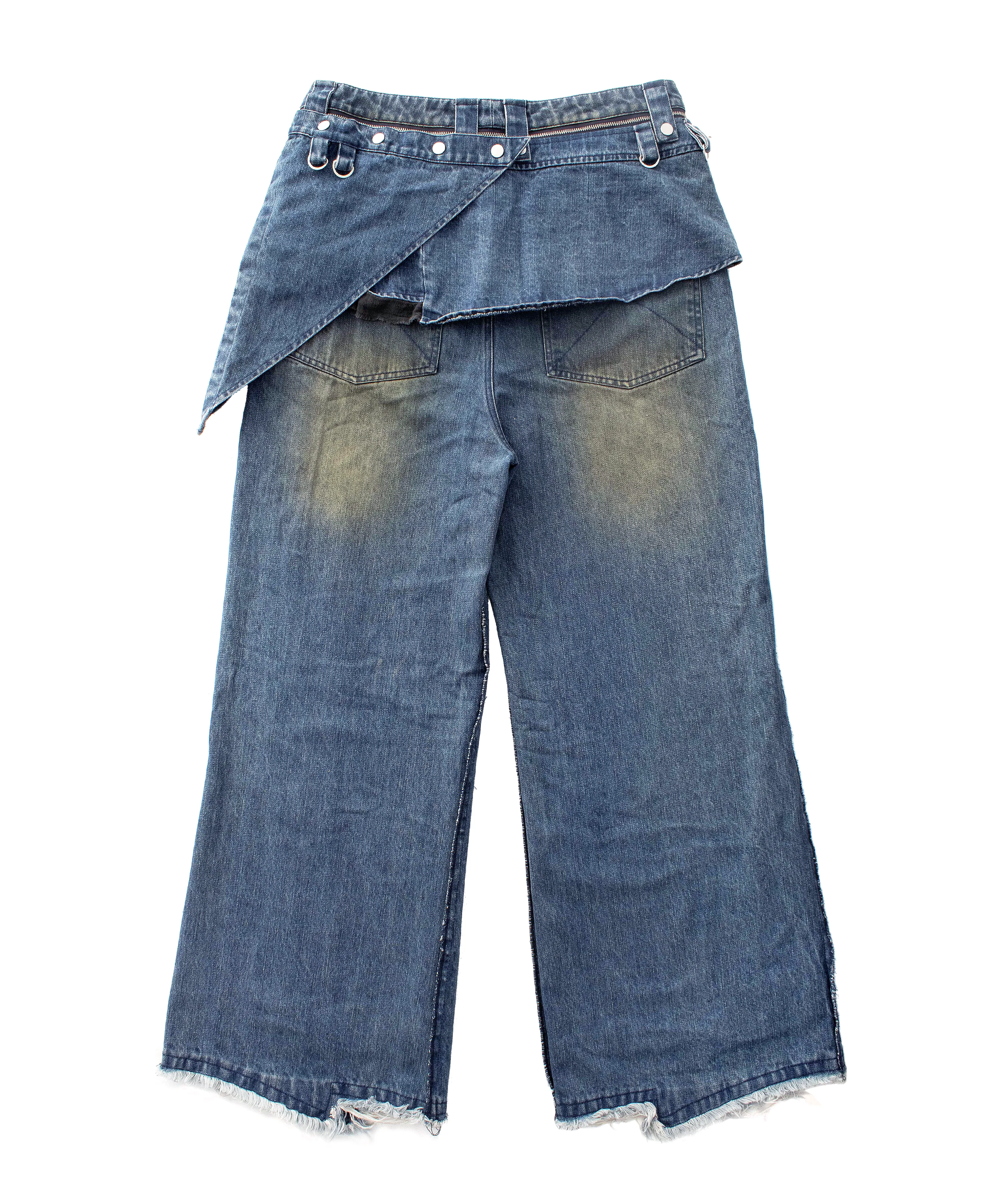 the âblue detachable-skirt flared denimâ is constructed from a heavy blue denim, and washed to perfection. the pants feature an inside thermal layer for added comfort and insulation. a skirt sits on top of the pants, and is detachable via a zipper that wraps around the waist. the skirt features 2 separate layers, detachable via a line of snap buttons. the belt loops can be connected to both the skirt and the body, and are attachable by a separate set of snap buttons. a distressed layer of crepe linen is placed underneath the pockets on the skirt, and frayed edges are added to the hem of the pants. the pants have a slight drop crotch, and feature a noticeable flare while still maintaining a baggy cut around the thighs and knees.