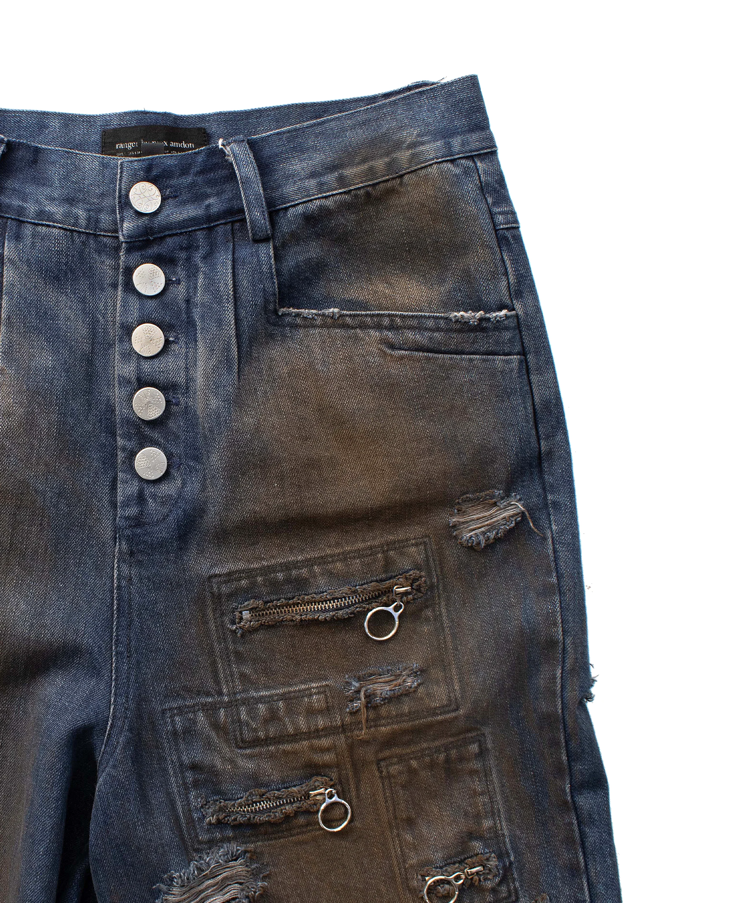 the âmud wash flared denimâ are constructed using a high quality cotton denim and feature a âmudâ brown wash on both the front and back side. three small pockets are placed on the front thigh, and various distressing and raw edge detailing is present across the front and back. five custom buttons close the fly, and additional hardware can be found across the body. long flared fit.