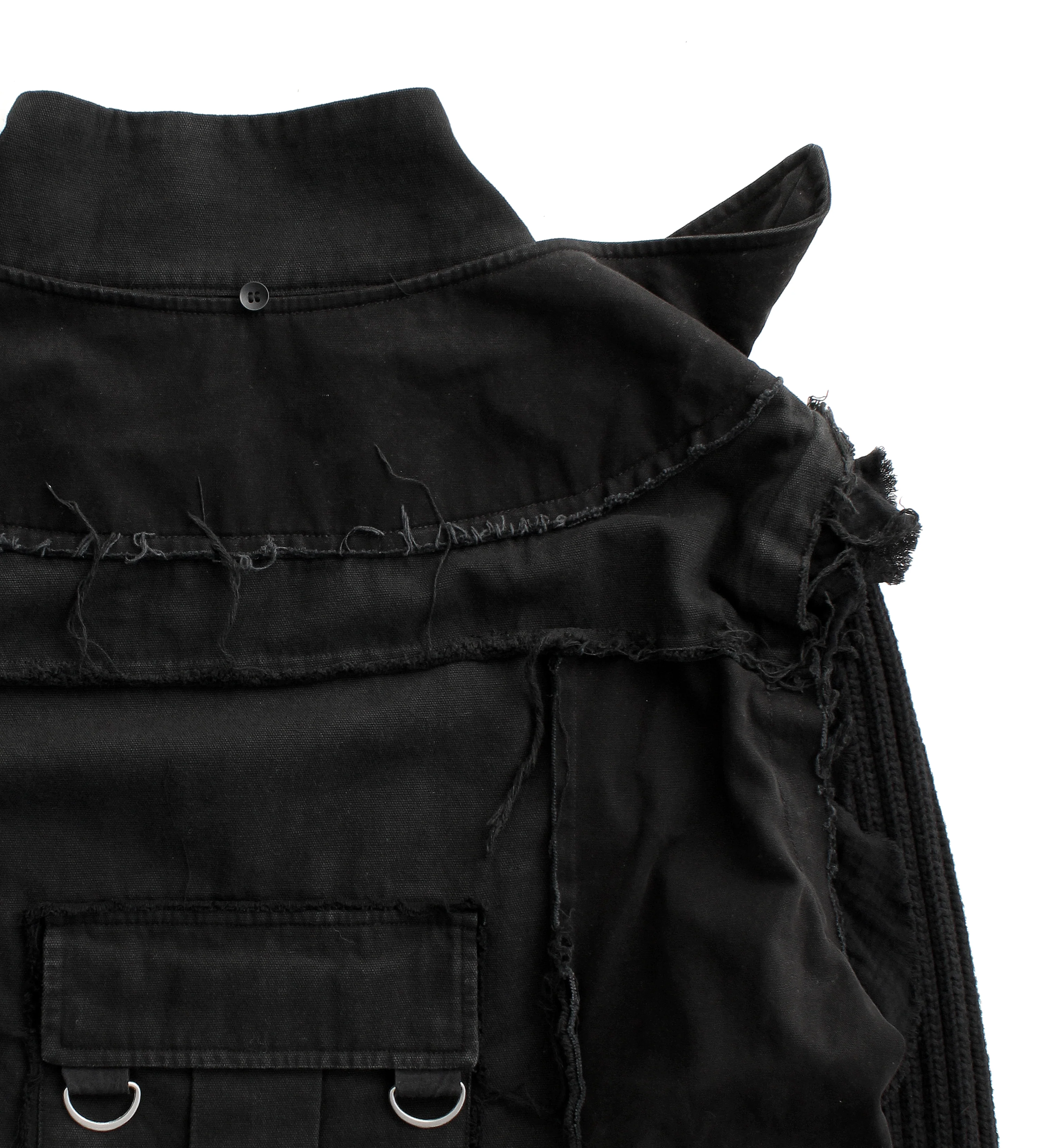 'the Gates horned jacketâ is constructed using a versatile pallet of materials to create a unique and distinguishable look. the body is constructed using cotton canvas, while the arms utilize a cotton knit material for a warm and snug feel. cotton crepe is also scattered across the jacket, poking out around the shoulders and underneath pockets with slight distressing. the jacket is hand distressed and cropped, intended to create a boxy look with elongated sleeves. limited quantities.